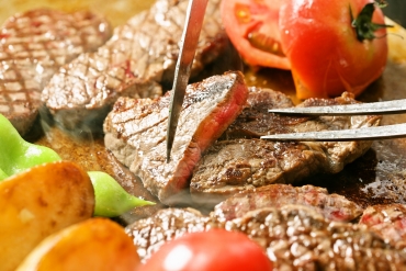 オープングリルにて熱々のお肉料理を調理してご提供しております。