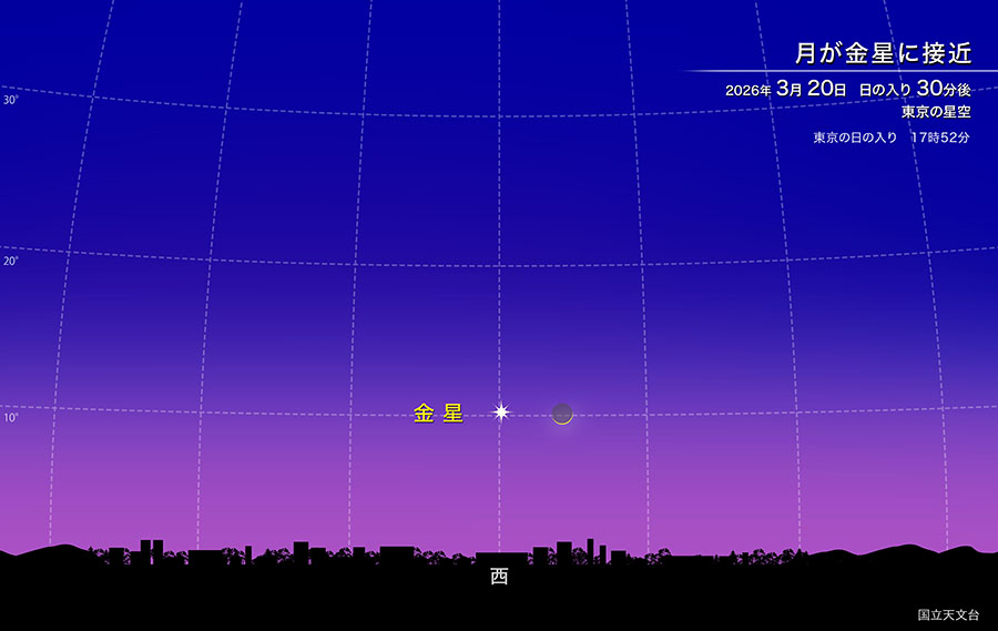 3月20日、春分の日の日の入り後に、月齢1.3の月が金星に接近しています。月も金星も高度が低く、その上、月がたいへん細いため、接近の様子を見るには場所や時刻に注意する必要があります。